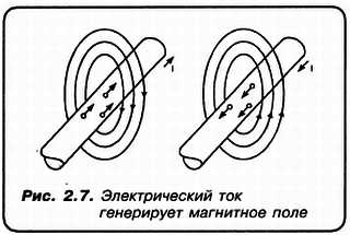 «А»: Согласен… А теперь взгляни на рис. 2.7. Итак, если силовые линии электромагнитного поля одиночного проводника имеют некоторую ПЛОТНОСТЬ, (когда по проводнику течет электрический ток), то если этот провод намотать хотя бы на шариковую ручку, то эта плотность будет возрастать ПРОПОРЦИОНАЛЬНО количеству витков. Ну, а если поменять направление тока, то изменится и магнитная полярность нашего ЭЛЕКТРОМАГНИТА!