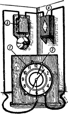 Звонковую сигнализацию легко использовать в качестве электрического будильника, который будет давать знать о наступлении определенного часа (рис. 51). Электрическая сигнализация имеет преимущества перед будильником: будильник звонит только в том месте, где он установлен, тогда как электрический звонок 3 может быть установлен и далеко от часов. Сигнал, подаваемый электрическим звонком, можно получить более громкий, чем от будильника.
