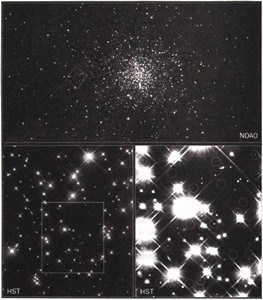Рис. 27.3. Древние белые карлики возрастом 12–13 млрд лет в шаровом звездном скоплении М4 в созвездии Скорпион. На верхнем снимке показано скопление целиком. На нижнем левом снимке — небольшая область этого скопления, сфотографированная космическим телескопом «Хаббл» (HST). На нижнем правом снимке — снятая с большей экспозицией и увеличенная часть этой области, где видны очень тусклые карлики, отмеченные кружками. С разрешения NASA и Н. Richer (University of British Columbia); NOAO/AURA/NSF.