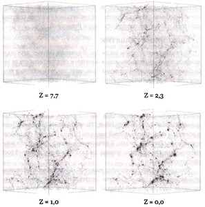 Ответ на этот вопрос, как мы его сегодня понимаем, заключается в том, что решающие возмущения плотности возникли не в обычной, а в темной материи. Она нечувствительна к влиянию излучения, и поэтому ее скучивание могло начаться раньше — еще в эпоху доминирования излучения, когда обычная материя, пронизанная излучением, была упругой и имела слишком большую длину Джинса. Пятна фонового излучения отражают скученность только обычного вещества в эпоху рекомбинации. Но возмущения плотности темного вещества в тот момент уже могли иметь гораздо больший масштаб, примерно 1 % или около того. Следовательно, темная материя конденсировалась в отдельные уплотнения, которые затем стягивали к себе окружающее их обычное вещество. Таким образом, первыми образовавшимися структурами были гало из темной материи. Они и стали основой галактик, которые позже росли в процессе многочисленных слияний разных гало и захваченного ими обычного вещества.