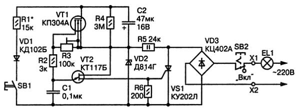 Если кратковременно нажать кнопку SB1, через R1 и VD1 зарядится конденсатор С2, откроется транзистор VT1 и зашунтирует R3. Резко увеличится ток заряда С1, а транзистор VT2 станет открываться в начале каждой полуволны. Несколько десятков секунд яркость лампы будет максимальной, пока не разрядится С2, и схема вернется в дежурный режим.