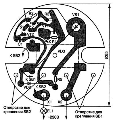 Лампы EL1 (их суммарная мощность не должна превышать 220 Вт) с нормально замкнутыми контактами выключателя SB2 включены в одну диагональ диодного моста VD3.