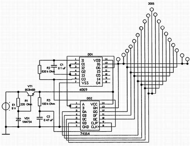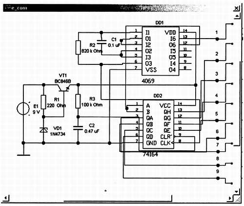 Для этого потребуется войти в раздел цифровых интегральных микросхем Digit и подобрать там КМОП микросхему 4069 и ТТЛ микросхему 74164. Разместив их в центре экрана, собираем слева источник питания: батарея Е1 = 9 В и стабилизатор напряжения на NPN транзисторе VT1 и стабилитроне (Zener Diode) VD1 (конкретные их типы для этой модели не принципиальны). Набрав далее необходимые резисторы и конденсаторы, собираем устройство управления елочной гирляндой. Собираем генератор, задающий тактовые импульсы, на инверторах микросхемы 4069 и подключаем его к 8-ми разрядному последовательному сдвиговому регистру на микросхеме 74164. На выходы регистра «навешиваем» гирлянду светоизлучающих диодов. В программе EWB мы используем для этой цели логический пробник (Probe), находящийся в разделе Indicators. Собрав все необходимые цепи, даем команду на моделирование. На компьютере возникает мигающая огнями елка.