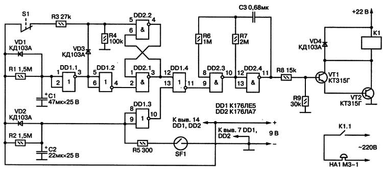 Здесь используются две микросхемы 176-й серии: DD1 — 4 элемента 2ИЛИ-НЕ и DD2 — 4 элемента 2И-НЕ. При подаче питания медленно заряжаются конденсаторы С1 и С2 соответственно через резисторы R1 и R2. Заряд длится 30–40 с, и за это время нужно успеть покинуть помещение и закрыть дверь. С момента включения и в процессе заряда конденсатора С1 на входе 2 DD2.1 действует низкий уровень, значит, на выходе 3 DD2.1 — высокий уровень. Элементы DD2.1 и DD2.2 образуют триггер, для которого активным сигналом является отрицательный перепад напряжения. Поэтому после того как С1 зарядится и на вход 2 DD2.1 поступит высокий уровень, состояние триггера не изменится и на выходе 3 DD2.1 останется высокий уровень. Поэтому на выходе 11 DD1.4 действует низкий уровень, запирающий мультивибратор, собранный на элементах DD2.3 и DD2.4.