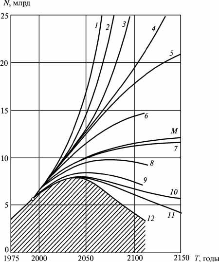 1-- постоянная рождаемость, 2 -- постоянная скорость роста, 3 -- кризис третьего мира, 4 -- высокий вариант ООН, 5 -- средневысокий вариант ООН, 6 -- медленный спад рождаемости, 7 -- средний спад рождаемости, 8 -- медленное снижение смертности, 9 -- постоянная смертность, 10 -- средненизкий вариант ООН, 11 -- низкий вариант ООН, 12 -- быстрое снижение рождаемости, M -- модельный расчет, o -- настоящее время. Область неизбежного роста заштрихована