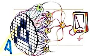 Само по себе такое устройство, конечно же, еще ничего не умело — ведь по сути у него не было даже какой-то схемы, а только полный хаос. Перцептрон нужно было обучить выполнению поставленной задачи. Вот перед нами только что изготовленный перцептрон. Будем показывать ему букву «а» в различных начертаниях. Если на выходе появится единица, значит, перцептрон «угадал» правильный ответ. Если же нет, то уменьшаем коэффициенты усиления для тех «нейронов», которые активнее всего участвовали в формировании неверного ответа. А затем повторим процедуру снова и снова — до тех пор, пока перцептрон не станет надежно опознавать букву «а». Если же немного усложнить схему, то можно сделать и перцептрон, различающий разные буквы, тогда его требуется обучать не только правильно опознавать каждую букву, но и отличать их друг от друга.