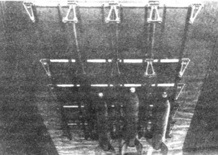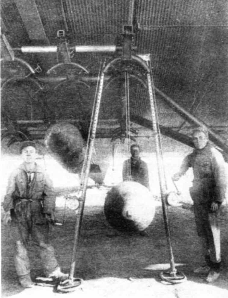 Подвеска бомбы АФ-1000 под ТБ-3 двумя ручными лебедками, 1934 г.