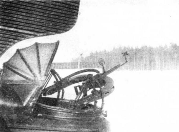 Пулемет ШКАС на кормовой турели бомбардировщика ТБ-ЗРН. Козырек-экран остеклен гибким целлулоидом и может складываться вперед, увеличивая поле обстрела