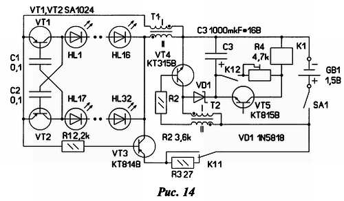 К исходной схеме (элементы VT1-VT3, HL1-HL32, T1, R1, С1,С2) добавлен дополнительный узел управления включением гирлянд светодиодов.
