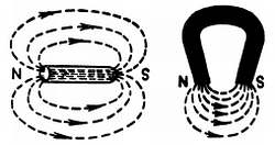 Рис. 12. Силовые линии магнитных полей (показаны пунктиром) идут от северного полюса к южному.