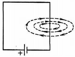 Рис. 13. Электрический ток, проходя по проводнику, создает вокруг него магнитное поле.