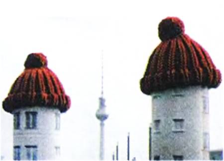 ДОМА В ШАПКАХ. Таким оригинальным образом дизайнеры Берлина решили обратить внимание своих сограждан на проблему экономии тепла. Ведь, по статистике, до трети тепла из наших жилищ улетучивается из-за плохо закрывающихся дверей, негерметичных окон, а то и щелей в стеновых панелях. Между тем, планету таким образом все равно не обогреть, а излишний расход топлива на ТЭЦ приводит к изрядному ухудшению экологии.