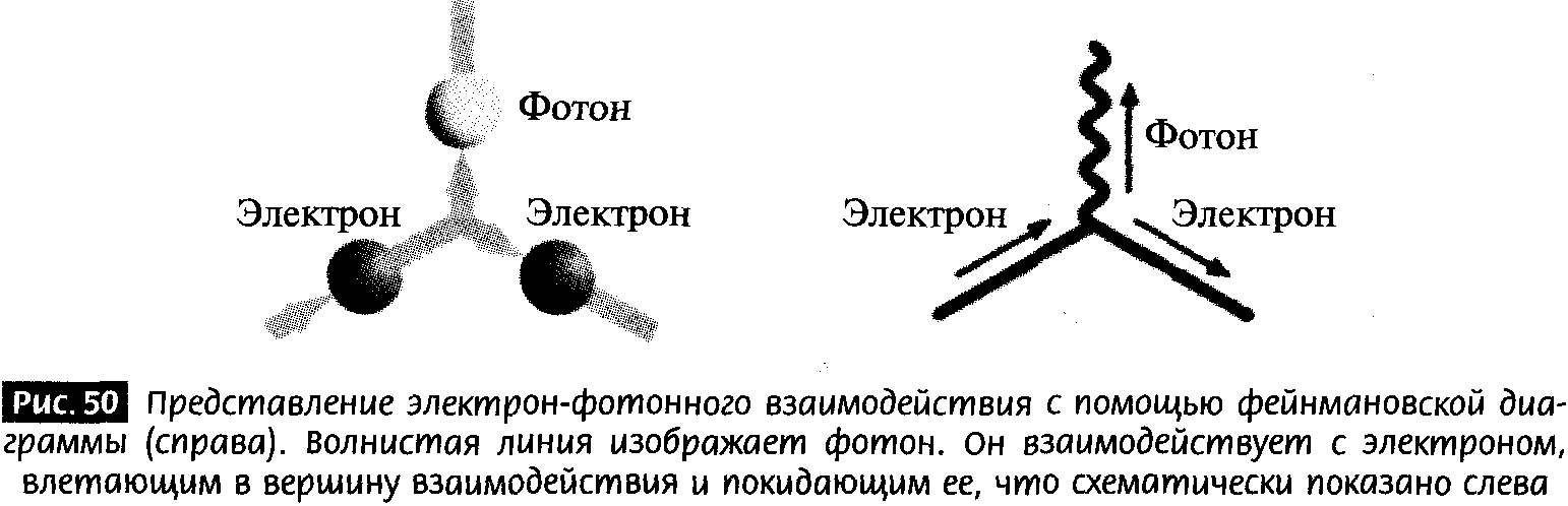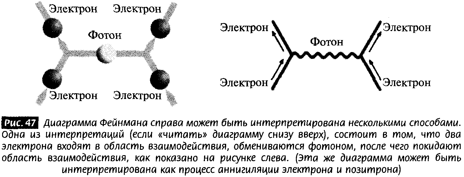 КЭД предсказывает, как обмен фотоном порождает электромагнитное взаимодействие. Например, в процессе, изображенном на рис. 47, два электрона влетают в область взаимодействия, обмениваются фотоном, а затем возникают в конечном состоянии (например, с конечной скоростью и направлением движения) за счет влияния сообщенной им электромагнитной силы. Теория поля сопоставляет каждому элементу диаграммы определенные числа, так что саму диаграмму можно использовать для количественных предсказаний. Эта картинка является примером диаграммы Фейнмана, названной так в честь Ричарда Фейнмана, и представляет собой графический способ описания взаимодействий в квантовой теории поля. (Фейнман был так горд этой выдумкой, что нарисовал некоторые диаграммы на своем фургоне.)