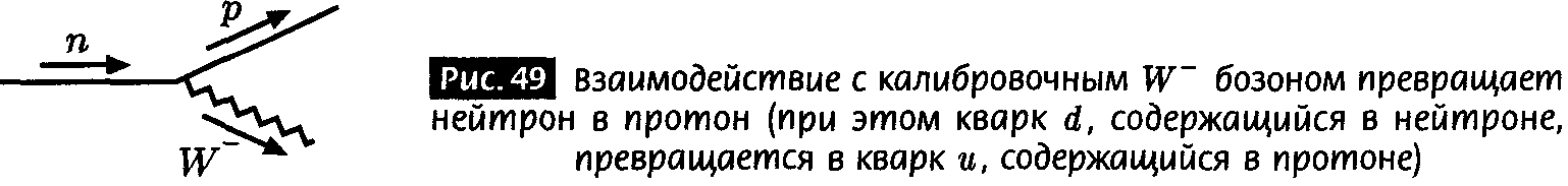 Нарушение четности, само по себе странное, является не единственным новым свойством слабых взаимодействий. Второе, в равной степени важное свойство заключается в том, что слабое взаимодействие может реально превращать частицу одного типа в частицу другого типа (сохраняя, тем не менее, полный электрический заряд). Например, когда нейтрон взаимодействует со слабым калибровочным бозоном, может возникнуть протон (рис. 49). Это сильно отличается от взаимодействия фотона, который никогда не сможет изменить полное число заряженных частиц любого конкретного типа (т. е. число частиц минус число античастиц), например, число электронов минус число позитронов. (Для сравнения, на рис. 50 показан фотон, взаимодействующий с электроном, который входит в область взаимодействия и покидает ее, а также схематическая диаграмма того типа, что мы использовали ранее.) Именно взаимодействие заряженного калибровочного бозона с нейтроном и протоном позволяет изолированному нейтрону распадаться, превращаясь в совершенно другие частицы.