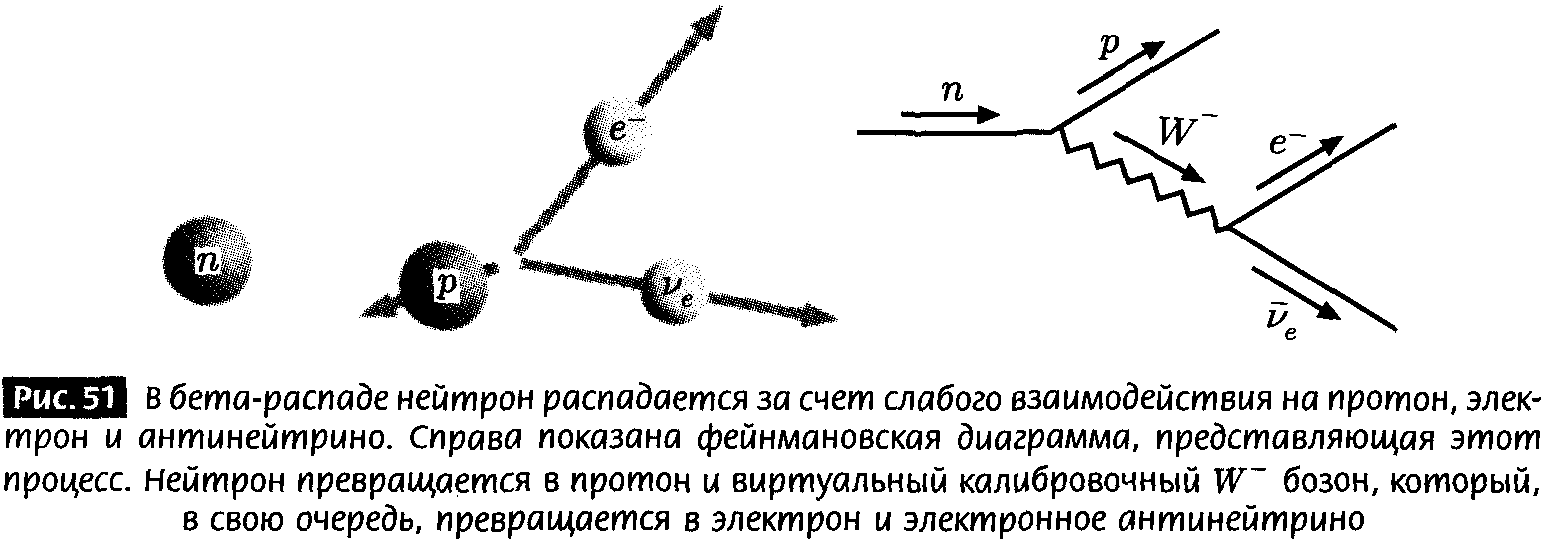 Однако, поскольку нейтрон и протон имеют разные массы и несут разные заряды, нейтрон должен при распаде породить протон и другие частицы так, чтобы при этом сохранялись заряд, энергия и импульс. Оказывается, что при распаде нейтрона образуется не только протон, но также рождаются электрон и частица, называемая нейтрино[93]. Такой процесс, показанный на рис. 51, называется бета-распадом.