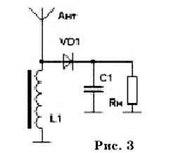 Попробуем же применить инвертор в детекторном приемнике. Где взять генератор импульсов для управления ключом? Ведь частота следования импульсов должна быть очень высокой, обязательно выше звукового диапазона (выше 20…30 кГц), иначе мы ничего не услышим, кроме писка самого инвертора. Вы не поверите, но оказывается, что такой импульсный генератор в приемнике уже есть! И частота следования импульсов равна несущей частоте принимаемой радиостанции. Чтобы в этом убедиться, давайте рассмотрим подробнее работу самого детектора и обратимся к схеме простейшего детекторного приемника (рис. 3).