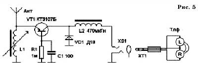 Телефоны подберите по максимальной громкости приема (если есть выбор), некоторые имеют совсем малую отдачу. Два стереотелефона лучше соединить последовательно, для этого используйте только «горячие» выводы разъема XS1, а «земляной» вывод оставьте свободным. Транзистор лучше выбрать германиевый, высокочастотный. Подойдут также ГТ313, КТ363, КТ3109 или устаревшие П403, П423, ГТ308. Испытайте транзисторы, какие найдете, и выберите лучший.