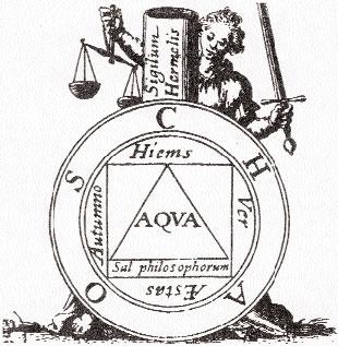 Хаос (chaos) вокруг; зима (hiems), весна (ver), лето (aestas) и осень (autumnus) трудятся над ВОДОЙ (AQUA) и солью философов (sal philosophorum).