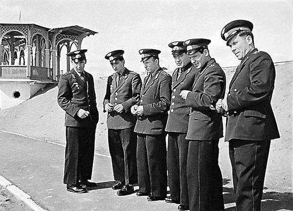 Лидирующая «шестерка» космонавтов у беседки на берегу Сырдарьи: Г. Г. Нелюбов, В. Ф. Быковский, Ю. А. Гагарин, А. Г. Николаев, Г. С. Титов, П. Р. Попович (10 апреля 1961 г.)