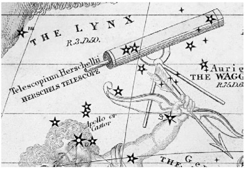 Не только имена монархов, но даже названия научных приборов не всегда задерживались на небесах. Так, в 1789 г. астроном Венской обсерватории Максимиллиан Хелл предложил созвездие Tubus Herschelii Major (Большой Телескоп Гершеля) в честь знаменитого 20-футового рефлектора Вильяма Гершеля. Разместить это созвездие он хотел между Возничим, Рысью и Близнецами, поскольку именно в Близнецах Гершель открыл планету Уран в 1781 г. А второе небольшое созвездие, Tubus Herschelii Minor, названное в честь 7-футового рефлектора Гершеля, Хелл предложил выделить из слабых звезд Тельца к востоку от Гиад. Однако даже такие милые астрономическому сердцу идеи не нашли поддержки у профессионалов.