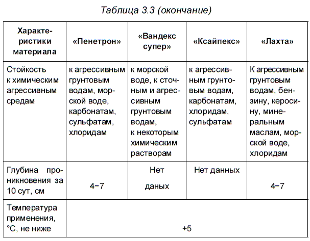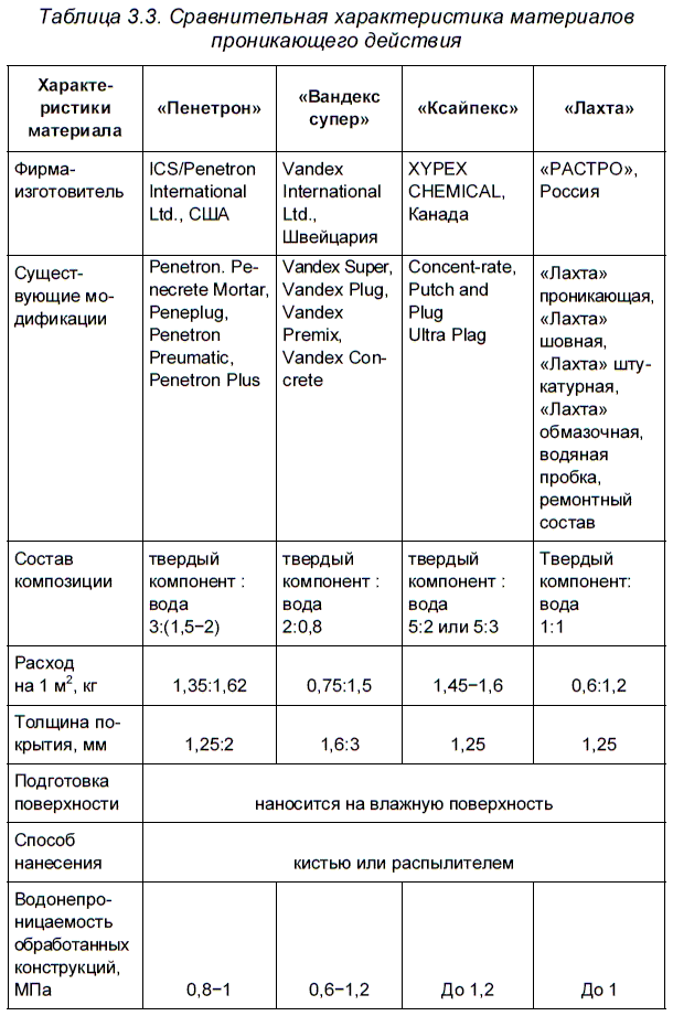 В течение нескольких лет в исследовательском центре «Прочность» при Петербургском государственном университете путей сообщения проводился сравнительный анализ качественных и количественных характеристик однотипных материалов проникающей гидроизоляции «Пенетрон» (США), «Вандекс супер» (Швейцария), «Ксайпекс» (Канада) и «Лахта» (Россия). Характеристики составов импортных гидроизоляционных материалов получены непосредственно от фирм-производителей и подтверждены специалистами исследовательского центра (табл. 3.3).