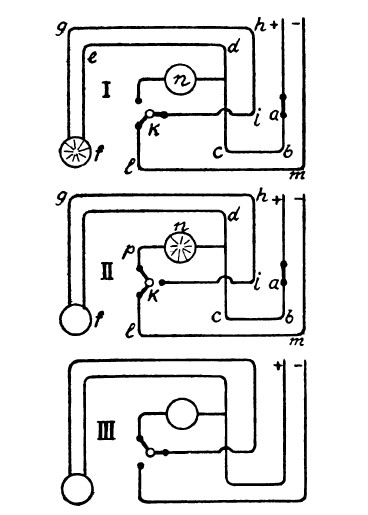 При входе в комнату замыкают ток включателем а; ток идет по проводу bcde в потолочную лампу ?, накаливает ее волосок и по проводам ghi, через замкнутый в положение I выключатель к и провод lm, возвращается в главную сеть.