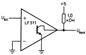 Напряжение на выходе переключается с уровня +5 В на уровень потенциала земли, когда напряжение на входе становится отрицательным. Эта схема представляет собой пример использования компаратора для аналого-цифрового преобразования. Это первый для нас пример схемы с открытым коллектором; прочитав гл. 8-11, вы увидите, что такую конфигурацию очень часто используют в логических схемах. При желании можно представить, что внешний «притягивающий» резистор дополняет внутреннюю схему компаратора и выступает в качестве коллекторной нагрузки для выходного транзистора n-р-n-типа. В связи с тем что выходной транзистор работает как насыщенный или разомкнутый переключатель, строгих требований к величине сопротивления резистора не предъявляют — обычно сопротивление выбирают в диапазоне от нескольких сотен до нескольких тысяч ом; небольшие величины сопротивления обеспечивают большую скорость переключения и повышают помехоустойчивость, правда за счет увеличения рассеиваемой мощности. Между прочим, несмотря на то что компараторы очень похожи на операционные усилители, в них никогда не используют отрицательную обратную связь, так как она понижает стабильность работы этих устройств (см. разд. 4.32-4.34). В то же время положительную обратную связь используют часто, вы убедитесь в этом, прочитав следующий раздел.