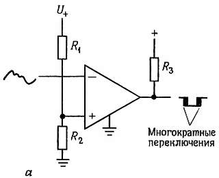 Простейшая схема компаратора, представленная на рис. 4.60, имеет два недостатка. При медленно изменяющемся входном сигнале напряжение на выходе также может изменяться достаточно медленно. Более того, если во входном сигнале присутствует шум, то на выходе может происходить дребезг в те моменты, когда напряжение на входе проходит через точку переключения (рис. 4.61).
