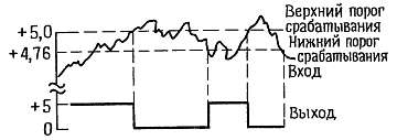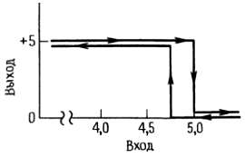 Резистор R3 создает в схеме два порога срабатывания в зависимости от состояния выхода. Для приведенного примера нижний порог срабатывания определяется уровнем 4,76 В при условии, что напряжение на выходе равно потенциалу земли (высокий уровень на входе); когда напряжение на выходе равно +5 В, то порог определяется уровнем 5,0 В. Вероятность того, что шумовой сигнал на входе вызовет многократные переключения выхода, в данном случае меньше (рис. 4.63).