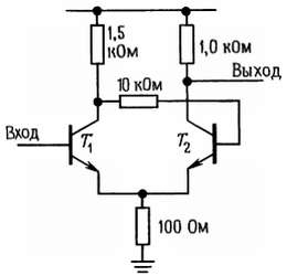 Транзисторы T1 и Т2 имеют общий эмиттерный резистор. Важно, чтобы коллекторный резистор транзистора T1 был больше, чем коллекторный резистор Т2. При выполнении этого условия пороговый уровень включения транзистора T1, который превышает напряжение на эмиттере на величину падения напряжения на диоде, уменьшается при включении транзистора T1, так как эмиттерный ток больше, если проводит транзистор Т2. Здесь, как и в рассмотренной выше интегральной схеме триггера Шмитта, наблюдается эффект гистерезиса для порогового напряжения триггера.