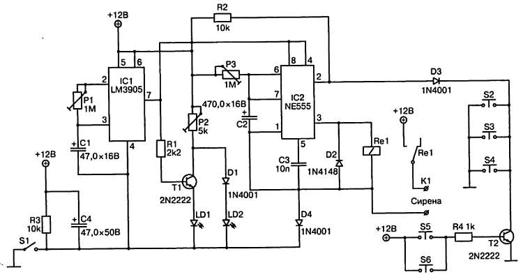 После включения сигнализации выключателем S1 активируется таймер переходного режима, выполненного на микросхеме IC1 (LM3905). Временная константа этого таймера определяется параметрами элементов Р1 и С1 и может устанавливаться в пределах от 0 до 50 секунд. Этого времени должно быть достаточно для выхода водителя из автомобиля и активации соответствующих датчиков. В качестве датчиков могут быть использованы, например, контактные замыкатели в дверцах, ультразвуковые датчики, а также другие сенсоры, которые на схеме обозначены как выключатели S2-S6. При этом указанные датчики могут работать как на замыкание на корпус (S2-S4), так и на замыкание цепи 12 В. Количество сенсоров практически неограниченно.
