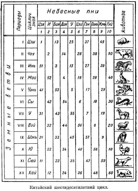 Особенно интересно, что «Небесные пни» в сочетании с «Земными ветвями» служили для своеобразного летосчисления. Оба цикла были объединены в «Таблице циклических знаков», охватывающей шестьдесят лет. Как видите, каждому году отведена своя клетка.
