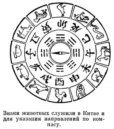 Любопытно, что теми же знаками «Земных ветвей» отмечались различные направления по компасу. Далекие предшественники этого прибора, «указатели юга», были впервые в мире изобретены китайцами еще до начала нашей эры. Север на старинных компасах обозначался знаком цзы, юг — у, восток — мао, запад — ю.