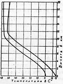 Ряд подобных подъемов в различных странах обнаружил неожиданный факт: оказалось, что температура падает лишь до высоты 10–12 км, где достигает примерно лишь 55°, а дальше, сколько ни поднимались (в отдельных случаях шары достигали высоты 36 км), температура остается почти постоянной или даже слегка повышается.