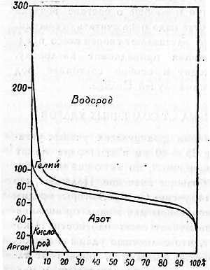 До высот, доступных человеку, воздух имеет примерно один и тот же состав: 79 частей азота, около 21 части кислорода и незначительные примеси углекислоты, аргона, гелия и водорода. Каждый ив газов ведет себя так, как если бы он был один и составлял свою особую атмосферу. С удалением от Земли уменьшается и давление каждого из газов; причем чем тяжелее газ, тем его давление с высотой падает быстрее, так как его больше остается внизу. Поэтому чем выше, тем меньше воздух должен содержать тяжелых газов — кислорода, азота — и больше легких — водорода и гелия. Сколько именно и на какой высоте, — можно рассчитать по содержанию каждого газа в нижних слоях; но это дело очень тонкое, и для тех газов, которых у Земли весьма мало, малейшая ошибка в определении их количества внизу даст значительную разницу наверху. Поэтому различные метеорологи получили неодинаковые схемы состава воздуха на высоте. Здесь приведена одна из позднейших по времени схем — схема Гемфриса.