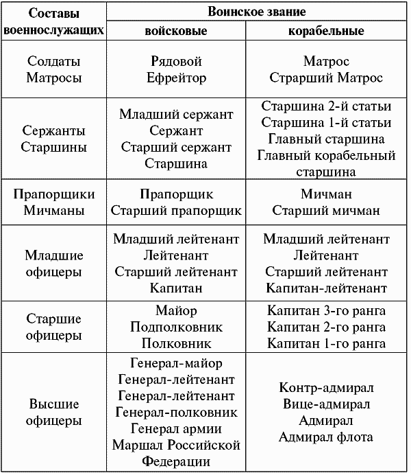 В Вооруженных Силах РФ, других войсках воинских формирований установлены составы военнослужащих и соответствующие им воинские звания. Перечень составов и воинских званий военнослужащих Вооруженных Сил РФ определен Федеральным законом РФ «О воинской обязанности и военной службе».