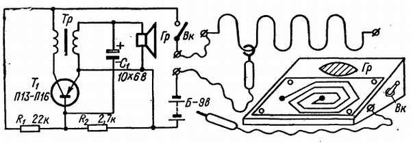 Звуковой генератор собирается на одном транзисторе Т1 типа П13 — П16 с коэффициентом усиления В порядка 30–40. Частота генератора определяется емкостью конденсатора С1 и сопротивлением резистора R1. Трансформатор Тр — любой выходной от транзисторного радиоприемника. Если имеется трансформатор, рассчитанный на работу в двухтактном режиме, то следует использовать половину первичной обмотки. Выход генератора нагружается маломощным громкоговорителем, например типа 0,2 ГД-1 (если при включении генератор не работает, необходимо поменять местами концы первичной или вторичной обмоток трансформатора).