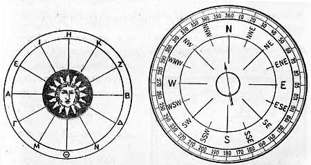 Рис. 47. Древнегреческий круг с указанием стран света и деление нашего современного компаса.