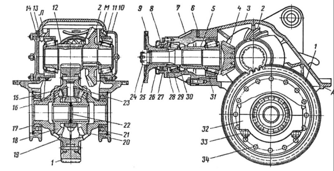 1 – цилиндрическая ведомая шестерня; 2 – коническая ведомая шестерня; 3 – картер редуктора; 4 – коническая ведущая шестерня; 5 – распорная втулка; 6 – прокладки; 7 – картер ведущей шестерни; 8 – сальник; 9 – фланец карданного вала; 10 – правое гнездо подшипников; 11 – прокладки; 12 – цилиндрическая ведущая шестерня; 13 – прокладки; 14 – левое гнездо подшипников; 15 – крестовина дифференциала; 16 – сателлит; 17 – шариковый подшипник дифференциала; 18 – шестерня полуоси; 19 – чашка дифференциала; 20 – опорная шайба шестерни полуоси; 21 – опорное кольцо подшипника дифференциала; 22 – разграничительная шайба; 23 – опорная шайба сателлита; 24 – гайка; 25 – тарельчатая пружина; 26 – грязеотражатель; 27 – крышка картера ведущей шестерни; 28 – маслоотражатель сальника; 29 – передний подшипник ведущей конической шестерни; 30 – регулировочная шайба; 31 – задний подшипник ведущей конической шестерни; 32 – крышка подшипника дифференциала; 33 – гайка крышки подшипника дифференциала; 34 – заклёпка