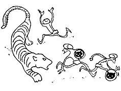 Тигр. «Есть четвероногое, подобное льву. Его находят в Индии, и называется оно тигр. Говорят, что он хранит своих детенышей в стеклянном шарообразном сосуде. Он быстр, как ветер. Когда заметит, что его детеныши унесены, бросается по следам похитителей и настигает их, какое бы пространство ему ни пришлось пробежать. Тогда охотники предлагают ему одного из детенышей, заключив его в стеклянный шар, и животное, пенясь, трясет этот шар, стараясь разбить его. После тщетных усилий он возвращает детеныша в свое логово, катя сюда стеклянный шар». (Единственное сказание «Физиолога» без христианского нравоучения.)