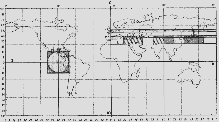 Схема Глобальной системы на рис. 177 выполнена в регулярной градусной сетке с шагом в 9°. Это оригинальная проекция позволяет продемонстрировать космологический смысл геодезического описания поверхности нашей планеты. Это полуквадрат, который делится еще на 8 полуквадратов (вместе – 9) и 10 квадратов. В нем уместна естественная прямоугольная система координат с меридианом Гринвича и параллелью экватора и деление на полушария Западное, Восточное, Северное и Южное и планетарные квадранты.