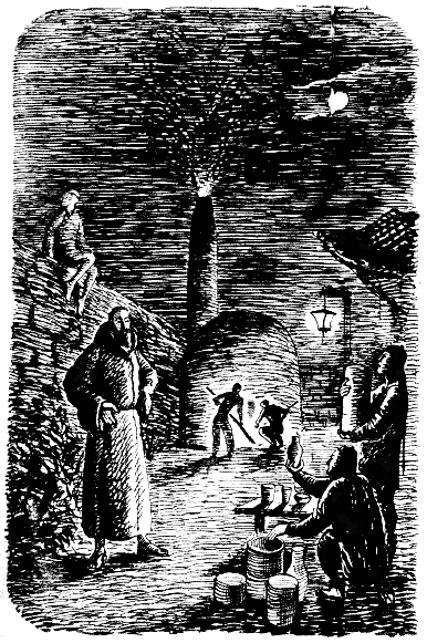 В углу двора пылала печь. Высокая труба сыпала искры в темноту. Перед огненной топкой молчаливо двигались темные фигуры. Это истопники делали свое таинственное дело.