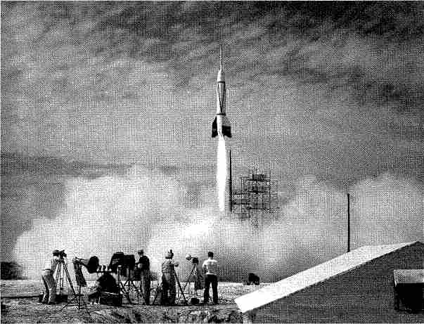 Рис. 1.9. Так все начиналось: запуск первой ракеты на мысе Канаверал (шт. Флорида). Эту ракету «Фау-2» немецкие инженеры создали под руководством Вернера фон Брауна еще в 1940–х гг. в гитлеровской Германии. Позже она стала американским трофеем, вместе с инженерами. В качестве второй ступени на ней установлена американская жидкостная ракета «ВАК-Капрал», которая, отделившись на высоте 32 км, достигла высоты 400 км, неся в головной части датчики температуры и космических лучей. Через два десятилетия отсюда же к Луне летали все пилотируемые экспедиции «Аполлон».