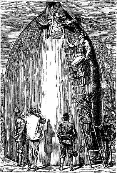 Рис. 1.14. «Через несколько мгновений из люка на верхушке конуса с торжествующим видом появился секретарь „Пушечного клуба*. За время „опыта" он еще больше растолстел». Недельный эксперимент по пребыванию в герметически закрытом снаряде «Колумбиады» прошел успешно. Вскоре герои Жюля Верна отправились в этом снаряде к Луне; «…нужен был смелый гений американцев, чтобы возникла мысль о завоевании нашего спутника». (Иллюстрация Henri de Montaut к изданию 1868 г.)