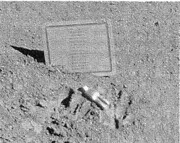 Рис. 1.20. Табличка с именами погибших космонавтов и маленькая скульптура, оставленные на Луне экипажем «Аполлона-15».