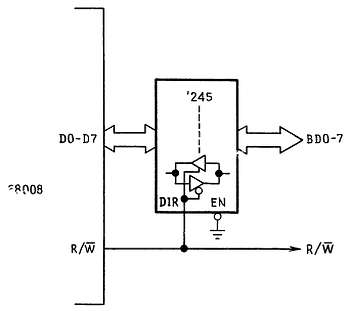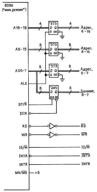 Выходной сигнал ALE (address latch enable, разрешение адресных фиксаторов) сопутствует правильному адресу и используется, как это показано на рисунке, для разрешения группы фиксаторов. Однако фиксировать данные нет необходимости, потому что стробирующие сигналы RD' и WR' действуют только когда сигналы данных имеют правильное значение. Обратите внимание на использование для буферизации двунаправленных линий данных приемопередатчика `245.