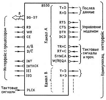 Рис. 11.25. Сигналы «последовательного коммуникационного контроллера» (УСАПП) Zilog 8530.