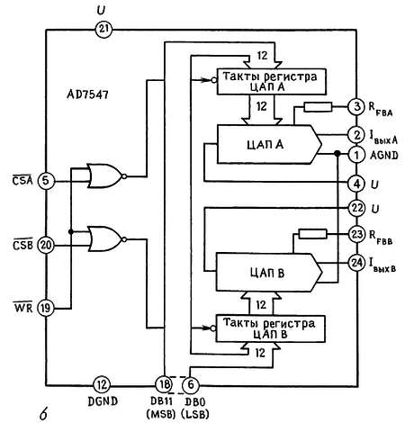 Рис. 11.29. 12-разрядные двухканальные ЦАП (с любезного разрешения Analog Devices), а — микросхема 7537 с шириной загрузки 1 байт; б — микросхема 7547 с шириной загрузки 12 бит.