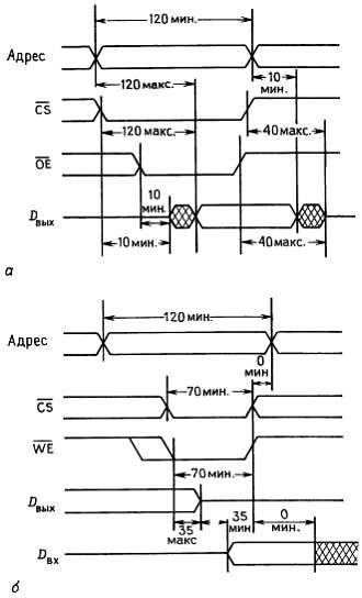 Рис. 11.30. Синхронизация статического ОЗУ с быстродействием 120 нc. а — цикл чтения, б — цикл записи.