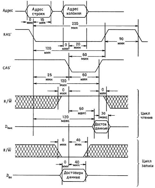 Рис. 11.31. Циклы чтения и записи динамического ОЗУ (Motorola, 120 нc).